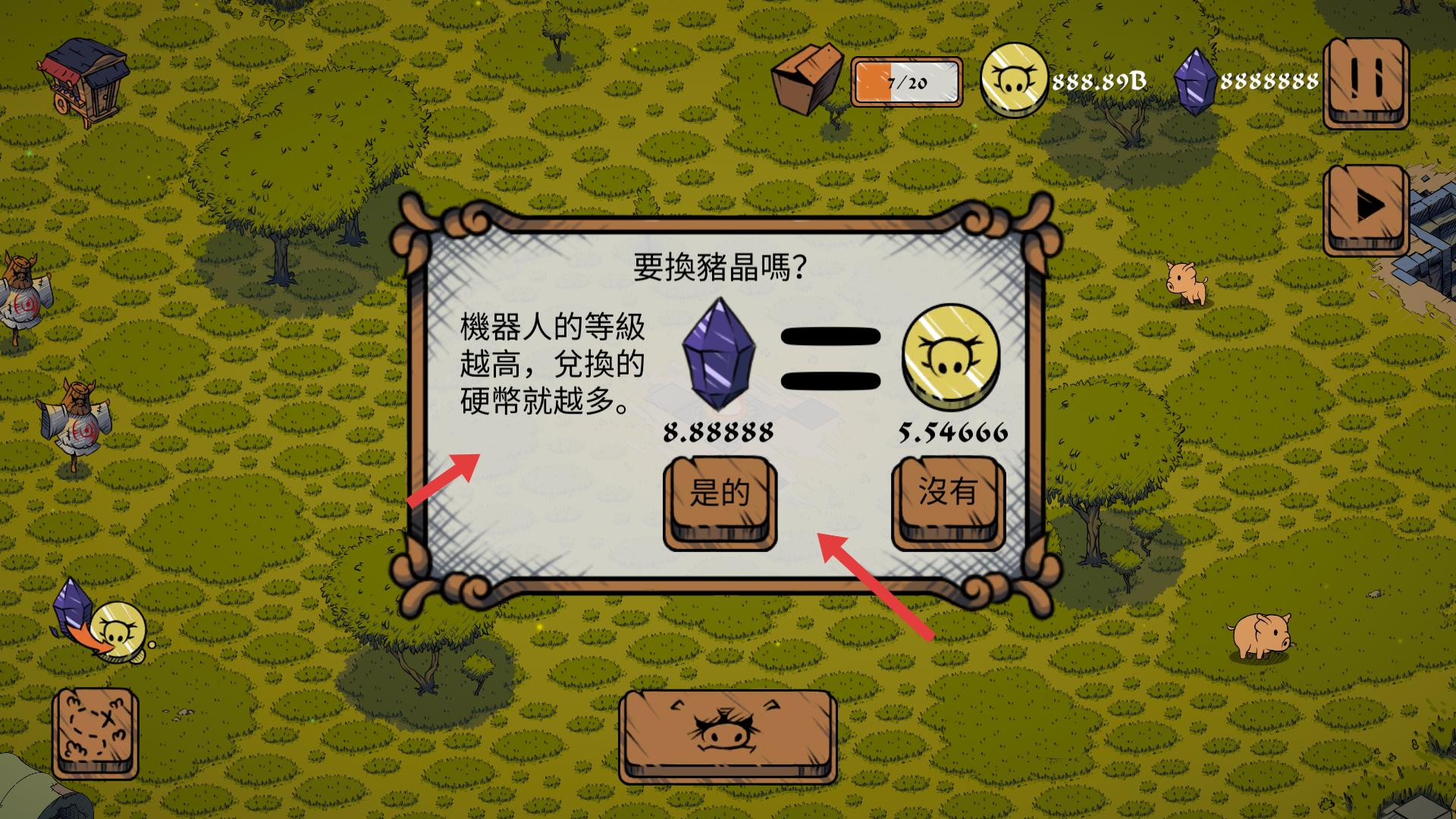 3、有要換豬晶嗎的提示界面,可選擇是否用豬晶兌換硬幣,機器人等級越高,兌換的硬幣越多。