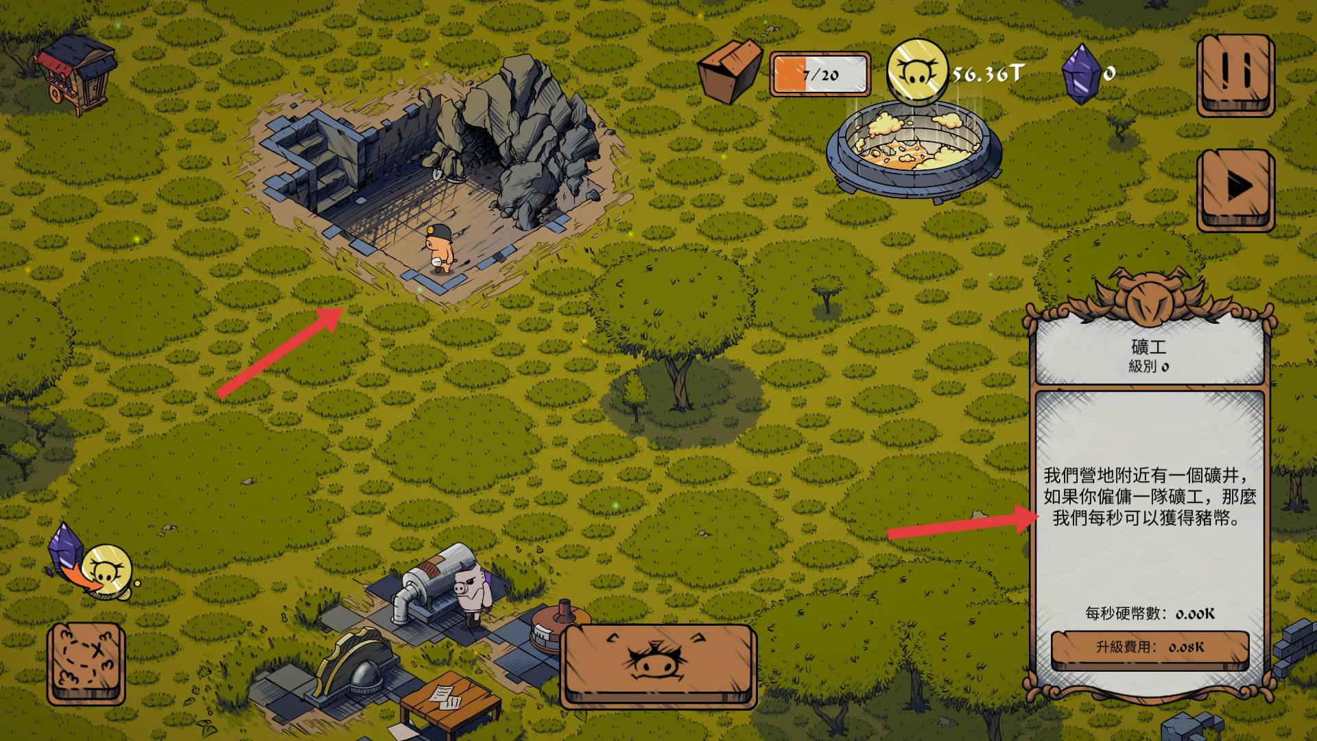 4、能看到營地附近的礦井,可雇傭礦工,這樣每秒能獲得豬幣,同時還可對礦工進行升級,提升豬幣獲取效率。
