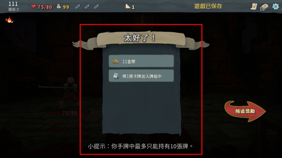3、擊敗敵人后,會獲得獎勵,可能是金幣,也可能是新的卡牌,這些獎勵能助力后續的戰斗和卡組構建。