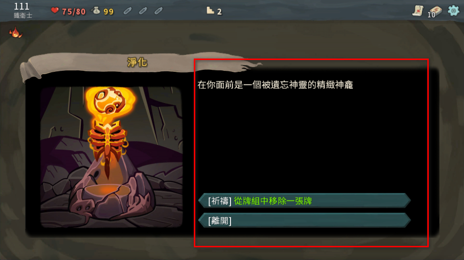 4、遇到被遺忘神靈的精致神龕時,可選擇祈禱,從牌組中移除一張牌,也能選擇離開,根據自身需求做決定。