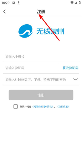 3、注冊界面,輸入手機號、驗證碼和包含數字、字母、特殊字符的密碼,勾選同意用戶協議和隱私政策后點擊注冊即可完成賬號注冊。