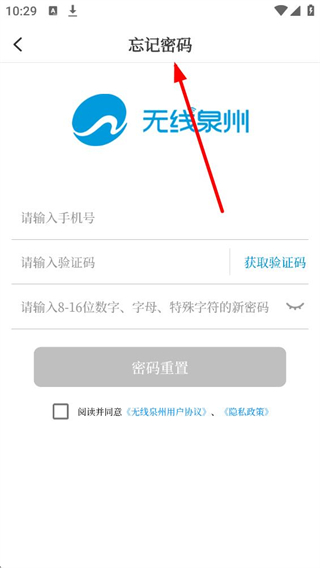 4、忘記密碼界面,輸入手機號、驗證碼和新密碼,勾選同意用戶協議和隱私政策后點擊密碼重置即可完成密碼修改。