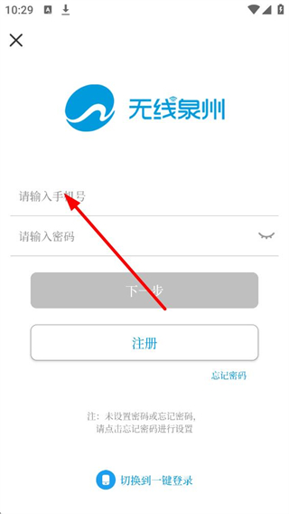 2、登錄界面,輸入手機號和密碼后點擊下一步即可登錄,也可選擇注冊或忘記密碼,還可切換到一鍵登錄方式。