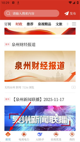 1、進入首頁界面,可瀏覽時政、推薦等多個板塊內容,查看泉州財經報道、泉州新聞聯播等資訊,還可使用搜索和發布功能。