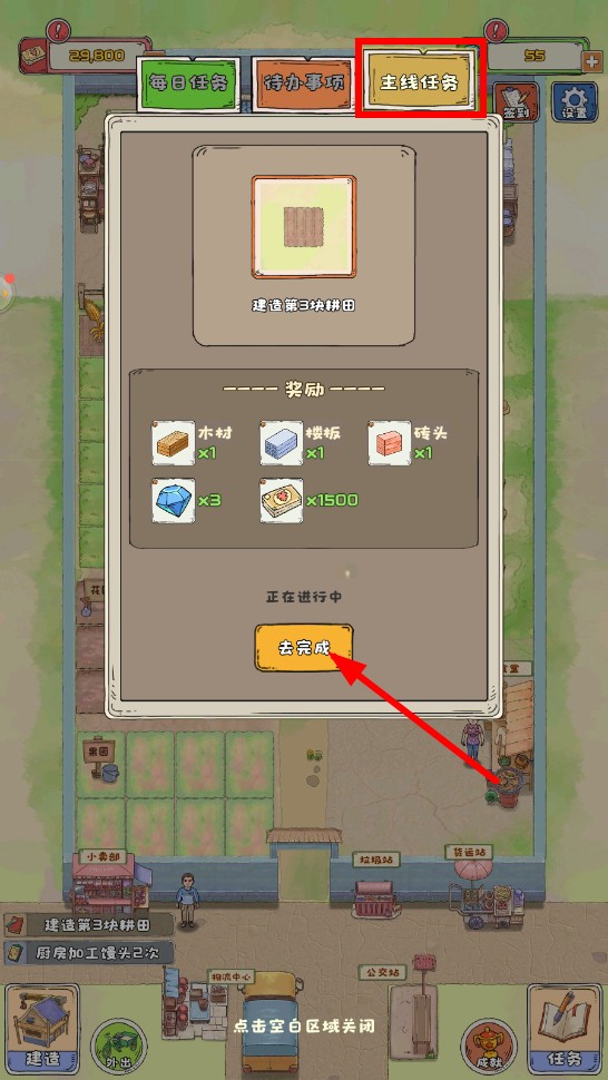 4、進入主線任務界面,能看到建造第3塊耕田等任務,點擊去完成按鈕,可著手完成任務,獲取木材、模板等獎勵,推動小院發展。