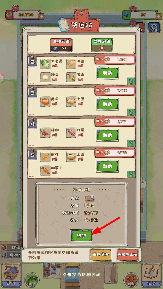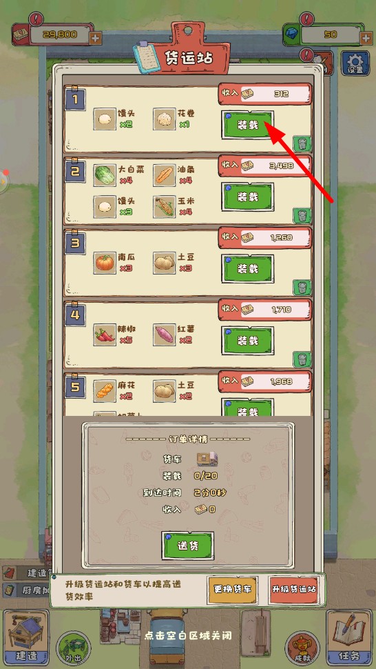 2、在貨運站界面,點擊對應訂單旁的裝載按鈕,可將饅頭、花卷等貨物裝入貨車,為送貨做準備,獲取收入。