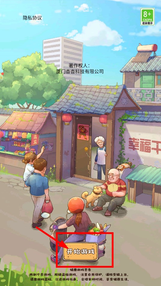 1、進入游戲先看到帶有小院場景的啟動界面,點擊開始游戲按鈕,即可開啟幸福小院的經營之旅,體驗田園生活。