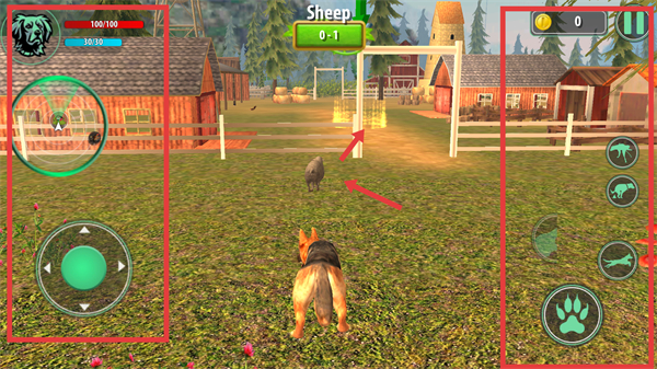 3、游戲過程中左側的操控區域用于控制牧羊犬的移動方向,右側分布著各類技能按鍵,你需要巧妙操控,引導羊進入農場的指定區域,以此達成放羊的目標。