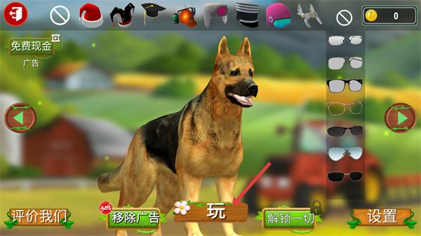 1、在游戲初始界面能看到一只形象逼真的牧羊犬,上方還有各類裝飾道具,若想開啟游戲只需點擊帶有花朵裝飾的玩按鈕,就能進入牧羊犬的冒險世界。