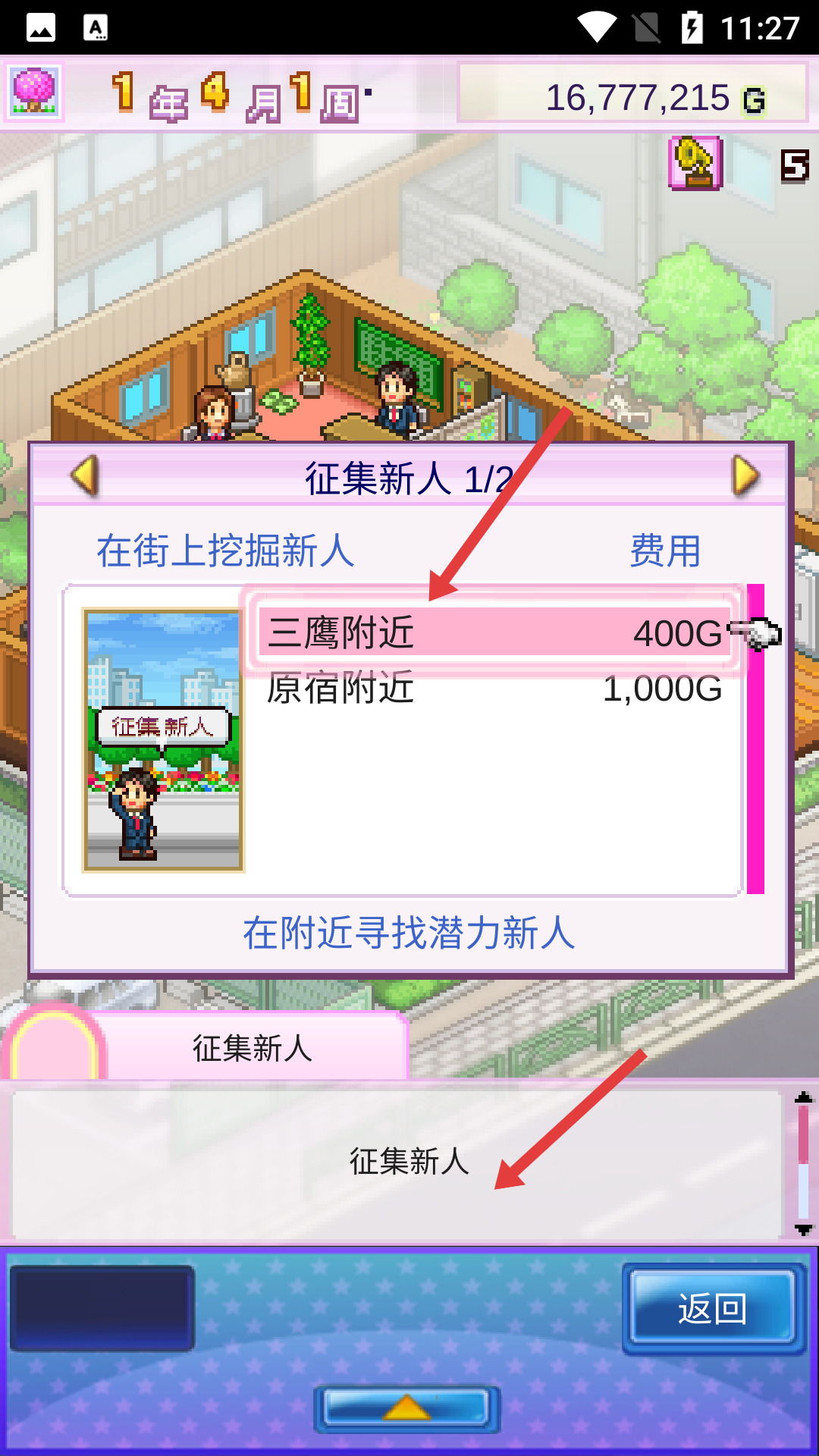 2、在游戲中選擇征集新人選項,進入新人征集界面,可看到不同地點及對應的征集費用,挑選合適地點進行新人發掘。