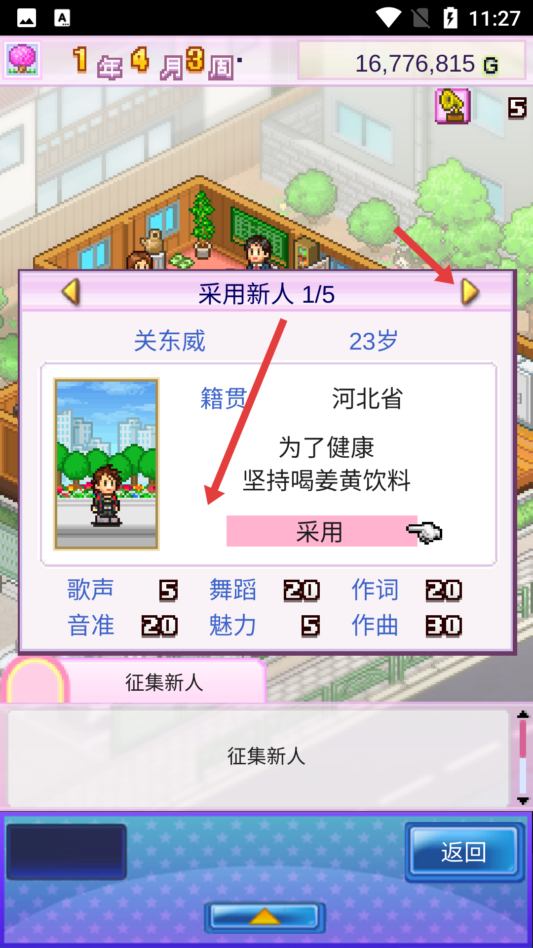 4、在出現的新人信息界面,查看新人的各項屬性,若覺得合適,點擊采用按鈕,將新人納入公司,為后續培養做準備。