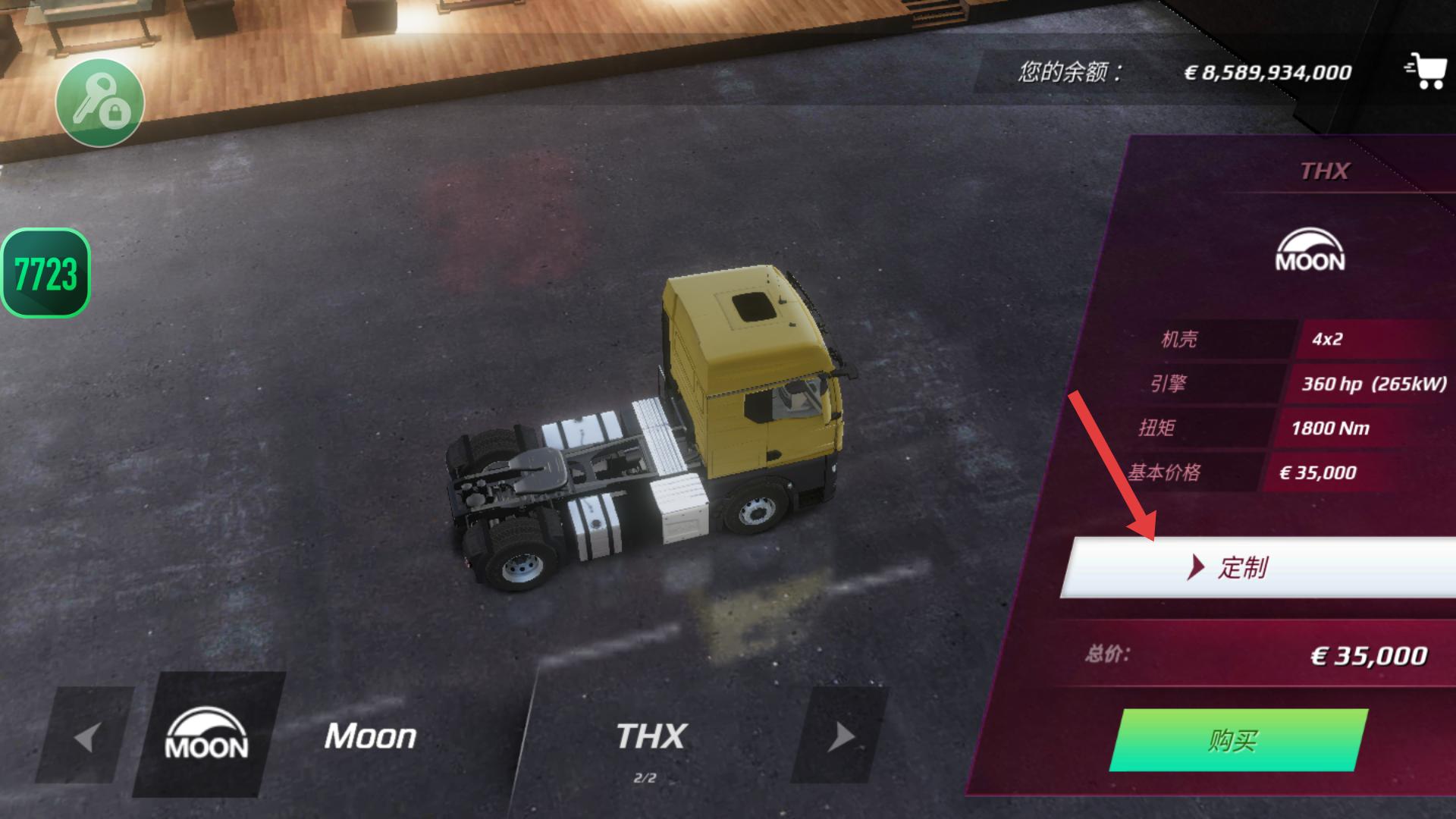 2、進入卡車選擇界面后,點擊右側的定制按鈕,可對卡車進行個性化的設置與改造,滿足不同的駕駛需求。
