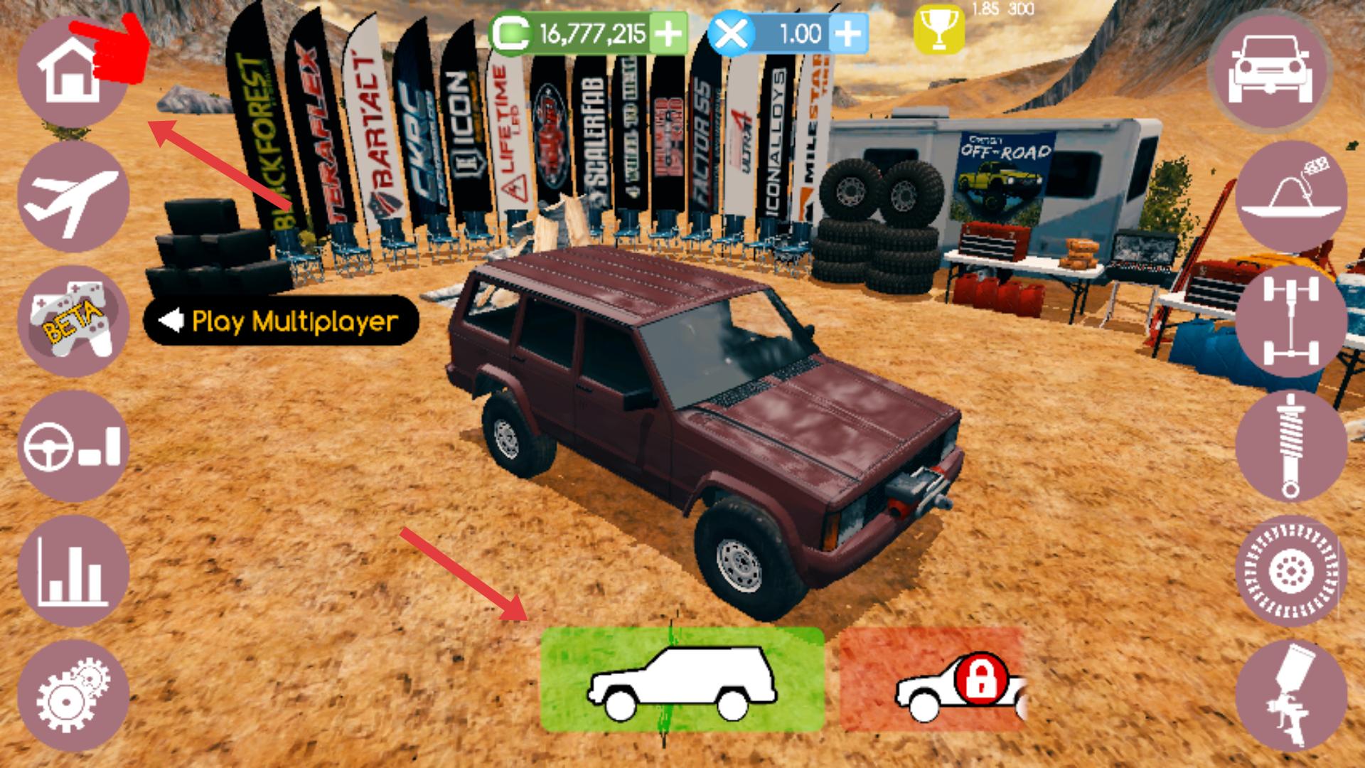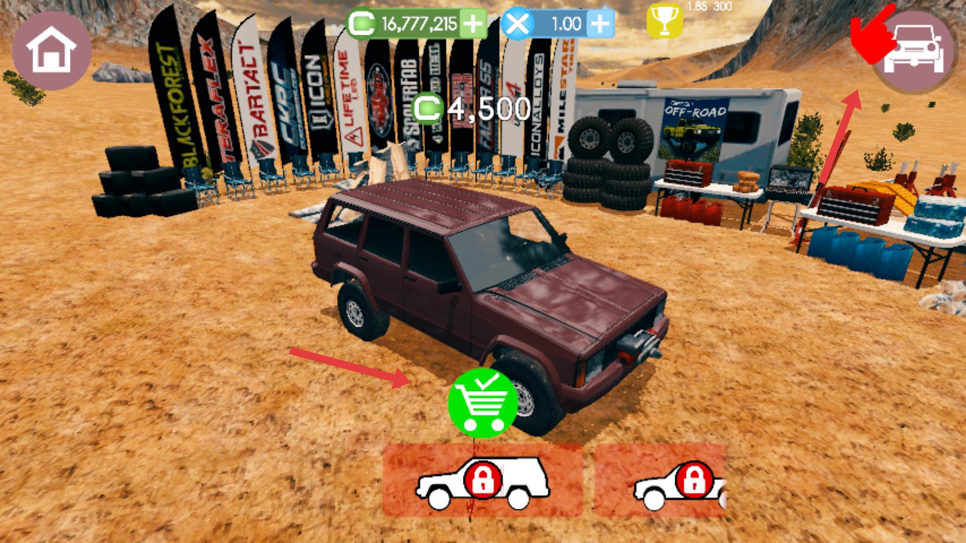 1、游戲初始界面有車輛展示,還有購物車等圖標,可查看車輛相關信息,選擇心儀車輛準備開啟越野駕駛。