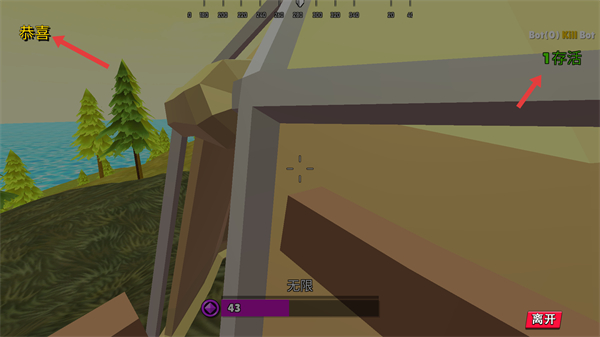 4、當存活人數只剩1時意味著成功吃雞,此時屏幕會顯示恭喜可點擊離開結束本局游戲,準備下一場戰斗。