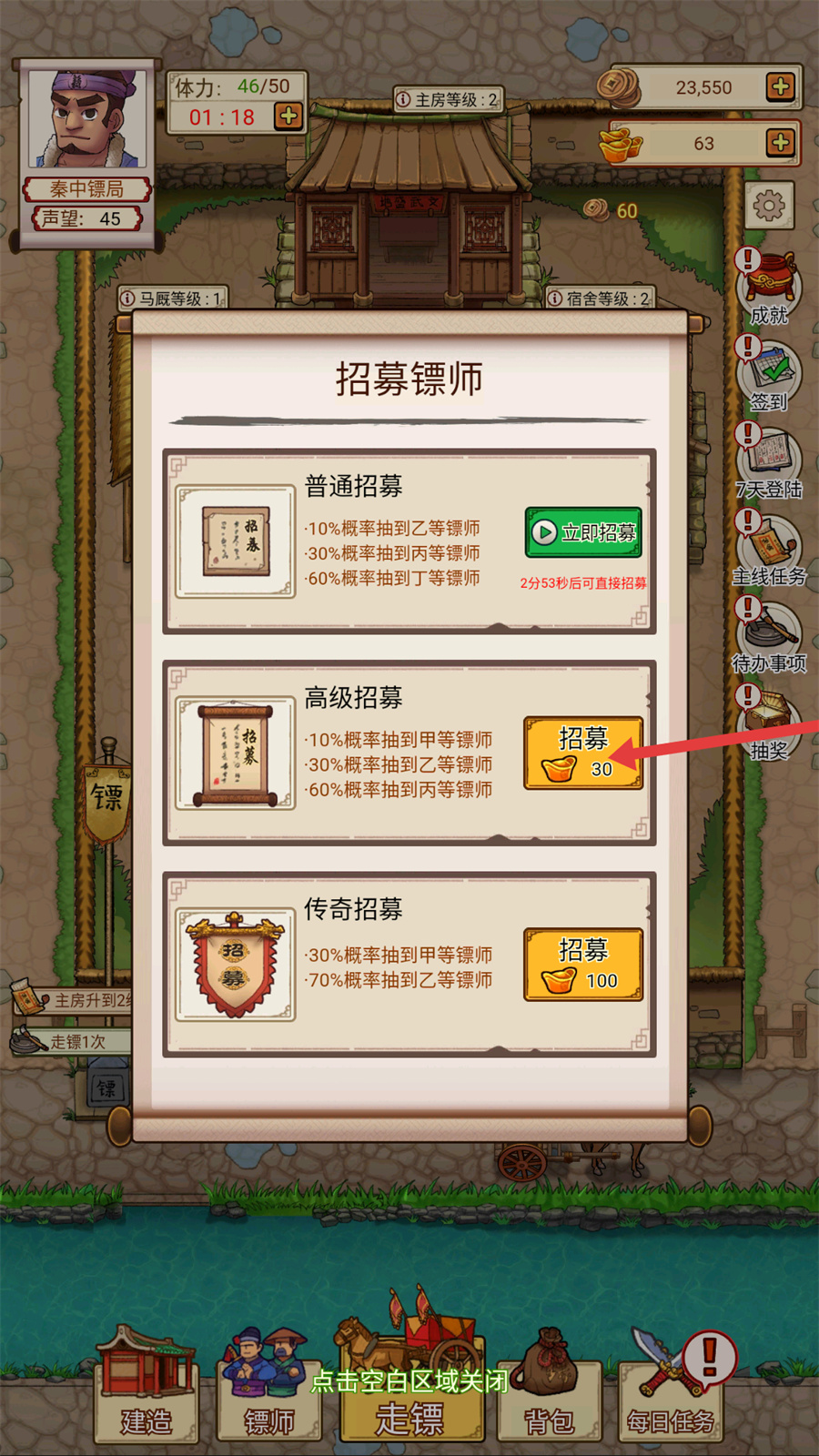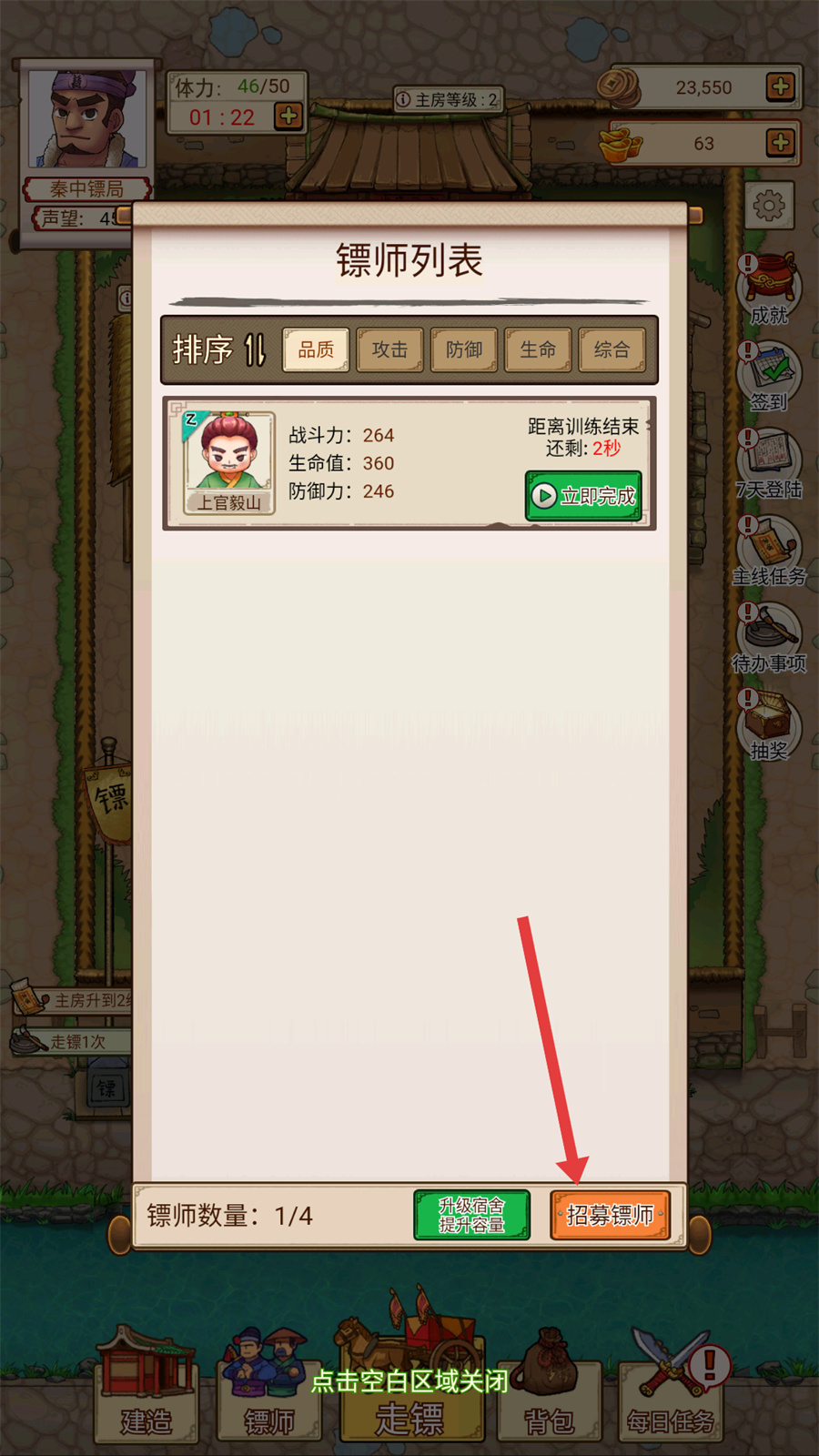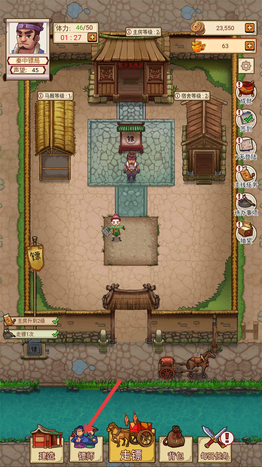 1、進入游戲主界面后,點擊下方的鏢師按鈕,進入鏢師列表界面,查看現有鏢師情況,準備進行鏢師相關操作。