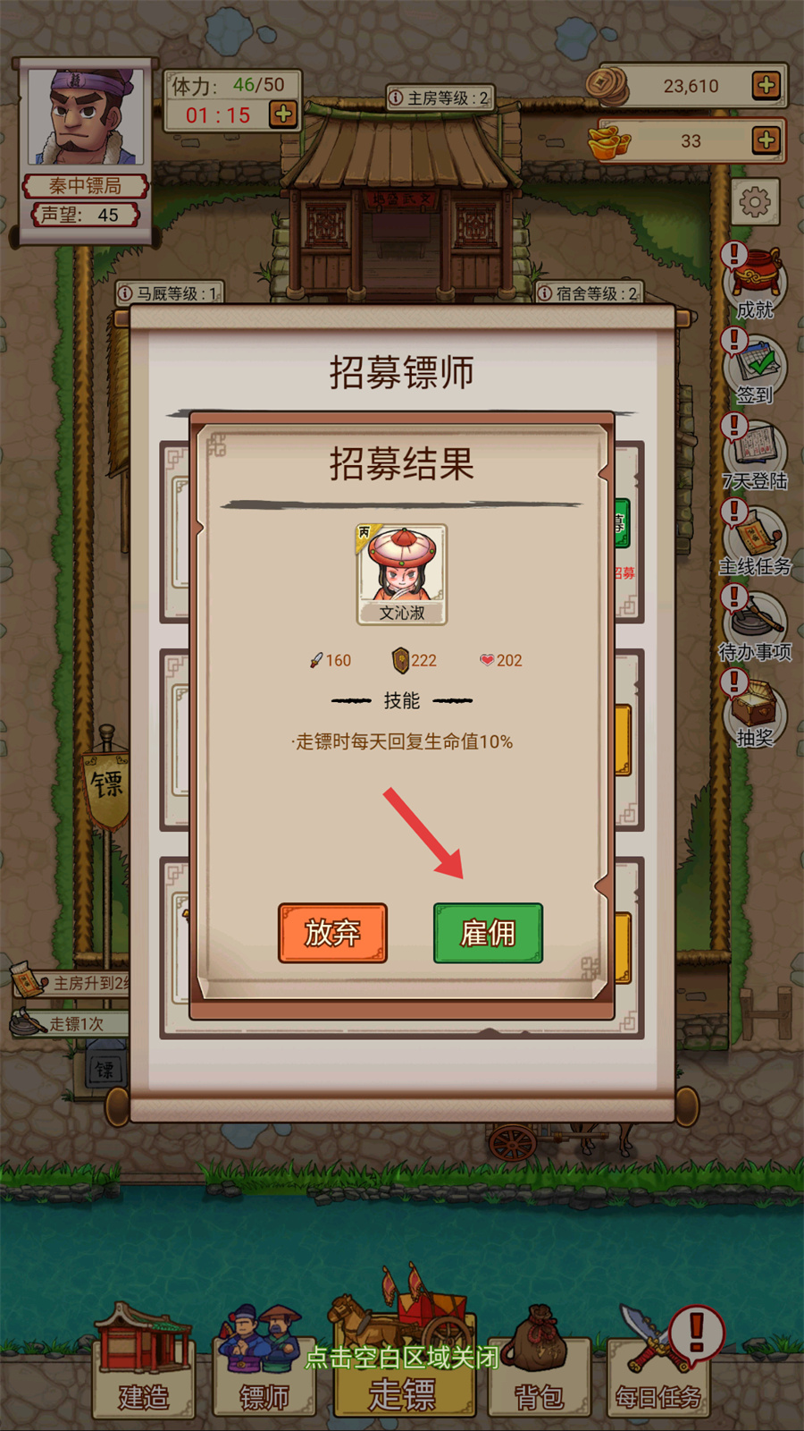 4、招募完成后,會彈出招募結果界面,展示招募到的鏢師信息,若覺得合適,點擊雇傭按鈕,將該鏢師納入自己的鏢局。