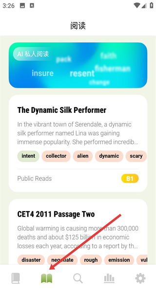 2、切換至閱讀板塊挑選如The Dynamic Silk Performer等文章,借助文中標注詞匯拓展閱讀,提升語境理解能力同步鞏固單詞記憶。