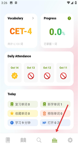 4、點擊底部圖表按鈕查看學習進度每日出勤等數據,通過數據復盤調整學習計劃,能夠有效助力提升學習效率。