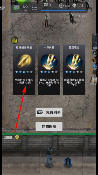 4、選擇槍械射擊齊射等技能,提升子彈數量和傷害,增強對怪物的輸出能力,推進末世防御的關卡劇情,獲取珍稀資源。