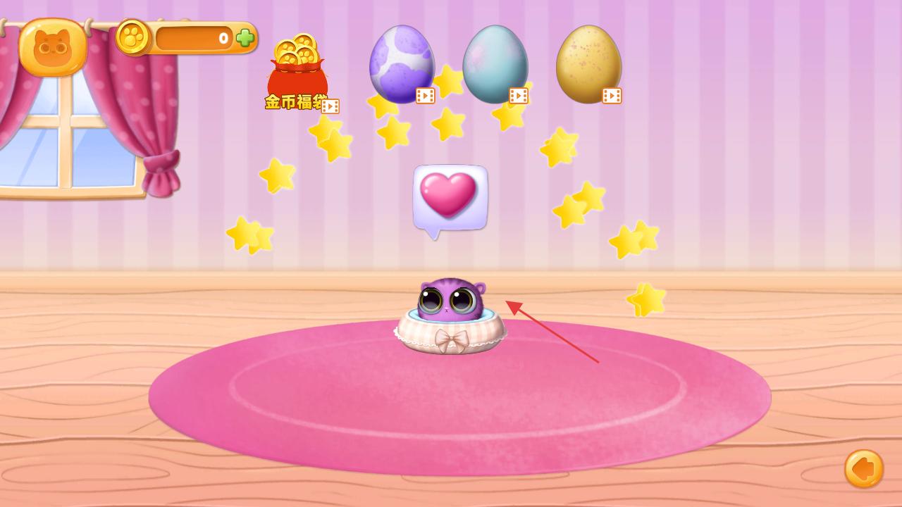 2、蛋孵化后會出現紫色寵物,此時可與寵物互動,滿足寵物需求,比如后續出現的喂食等操作,促進寵物成長。