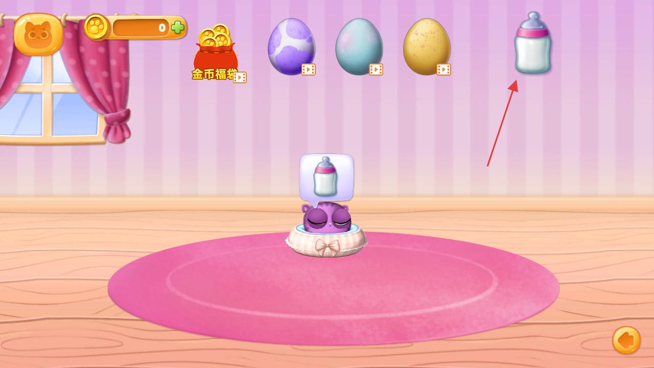3、當寵物上方出現奶瓶圖標時,點擊獲取奶瓶道具,及時給寵物喂食,這是照顧寵物、推進游戲的重要步驟。