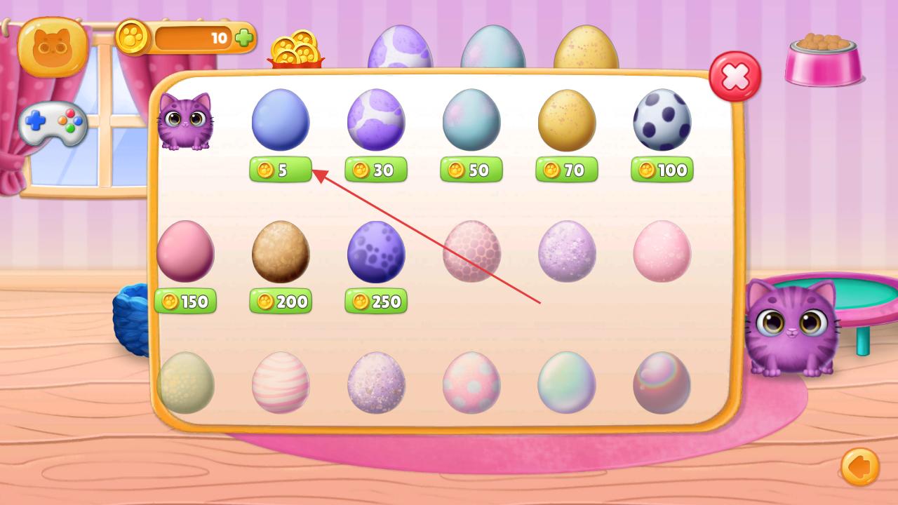 4、后續可進入蛋的選擇界面,根據金幣數量挑選不同的蛋,不同蛋需要的金幣不同,孵化后能獲得不同寵物,豐富游戲體驗。