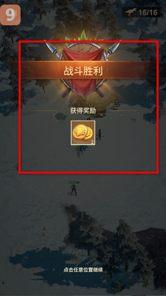 2、成功戰勝所有恐龍后,會顯示戰斗勝利界面,能獲得金幣等獎勵,點擊任意位置就可以繼續后續的游戲流程。