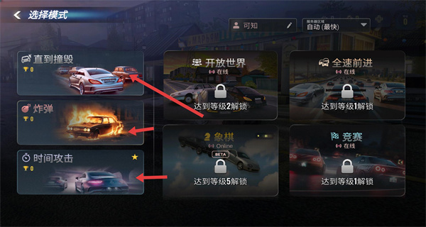 3、模式選擇界面,直到撞毀和炸彈時間攻擊為免費解鎖模式,選擇任意一個即可進入對應玩法開始賽車挑戰。