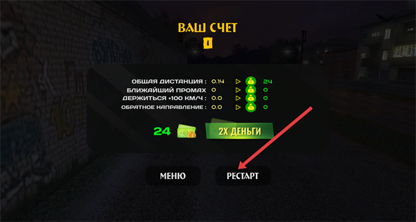4、游戲結束后玩家能夠獲取游戲獎勵,玩家若想重玩點擊屏幕下方的РЕСТАРТ,即可再次挑戰提升駕駛表現。