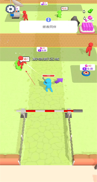 3、離開基地后,接到拯救同伴任務,場景中有受困同伴和提示,操控角色靠近受困同伴,準備實施拯救行動。