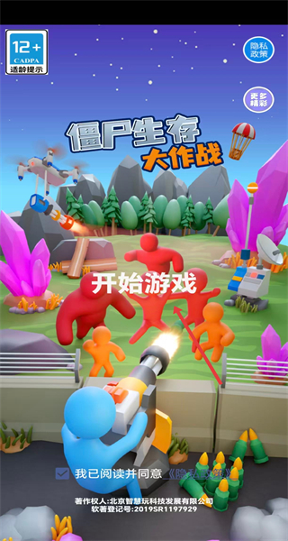 1、打開僵尸生存大作戰,進入初始界面,界面有開始游戲提示,還有隱私政策等相關標識,點擊開始游戲,進入游戲基地場景。