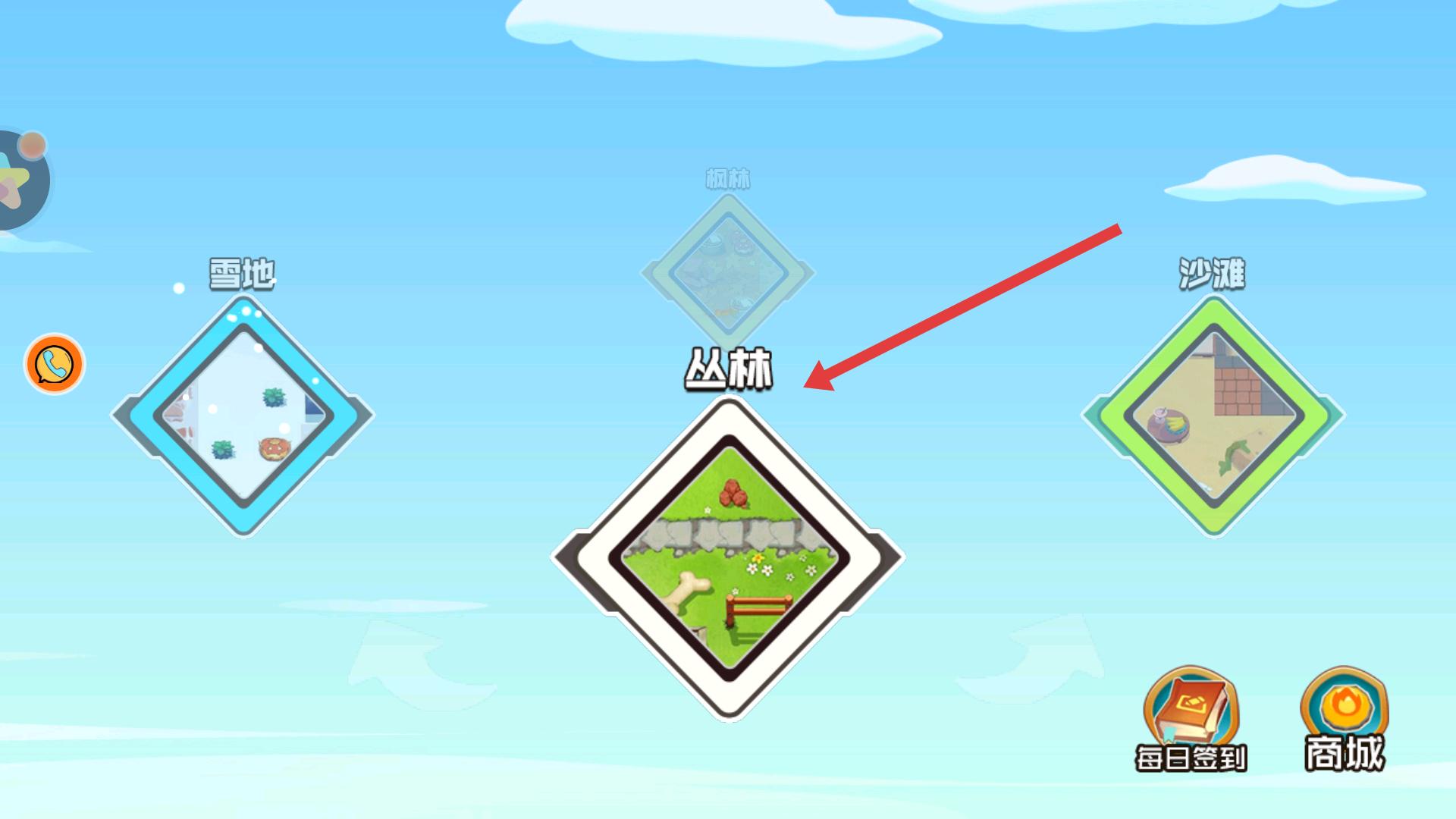 4、完成簽到和商店操作后,進入場景選擇頁面,看到雪地、叢林、沙灘等不同場景,選擇想要探索的場景,比如叢林進入該場景開始探索。