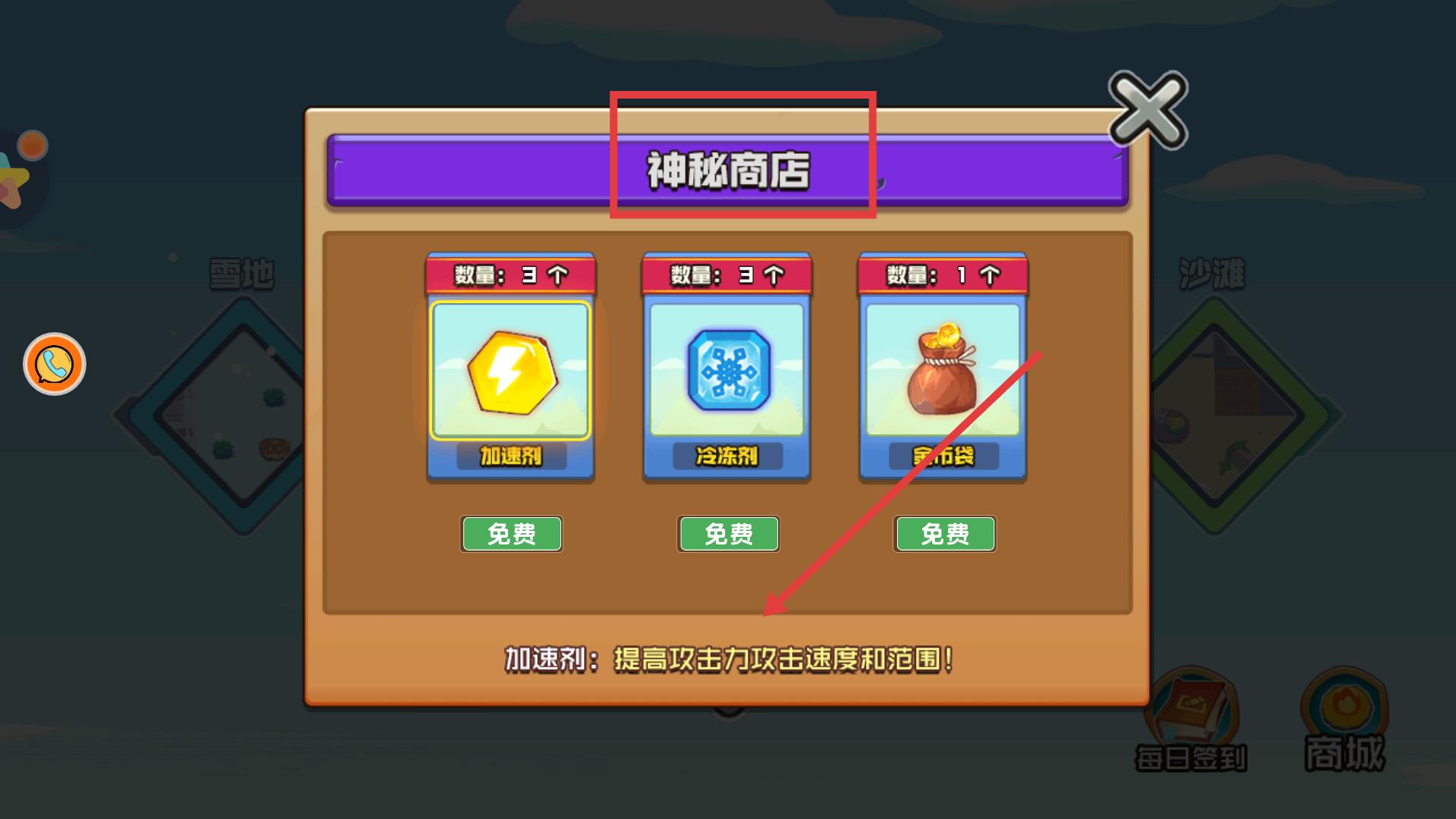 3、領取簽到獎勵后可能會進入神秘商店頁面,看到加速劑、冷凍劑、金幣袋等道具,可根據需求選擇免費領取的道具。