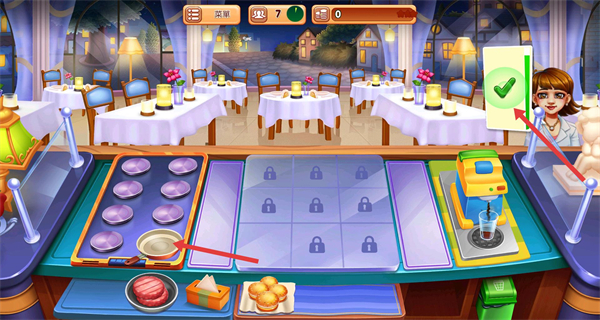 2、玩家在顧客下單后按需求取食材,依箭頭提示將肉餅放煎鍋開始制作菜品,要注意顧客的綠條耐心值。