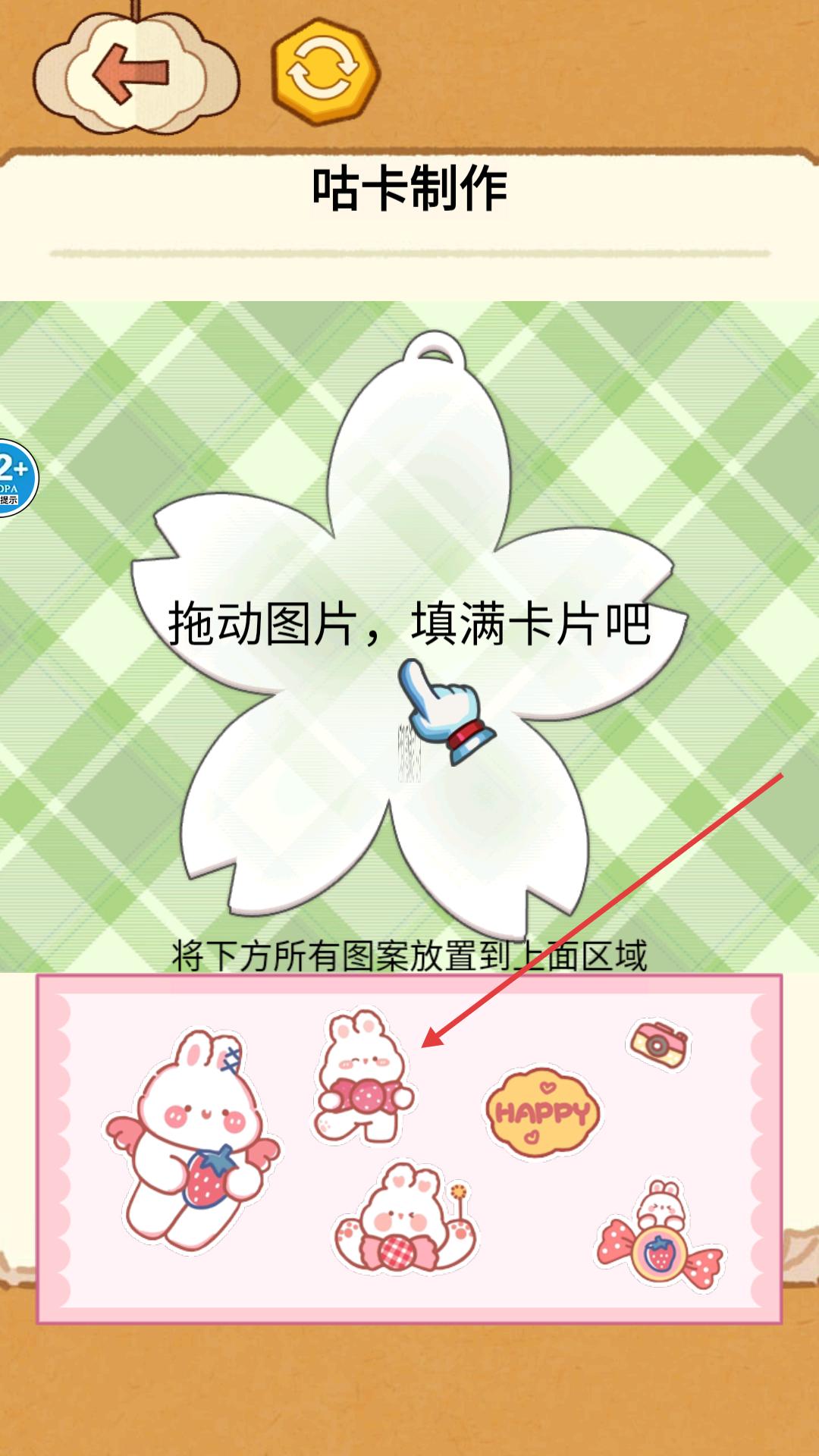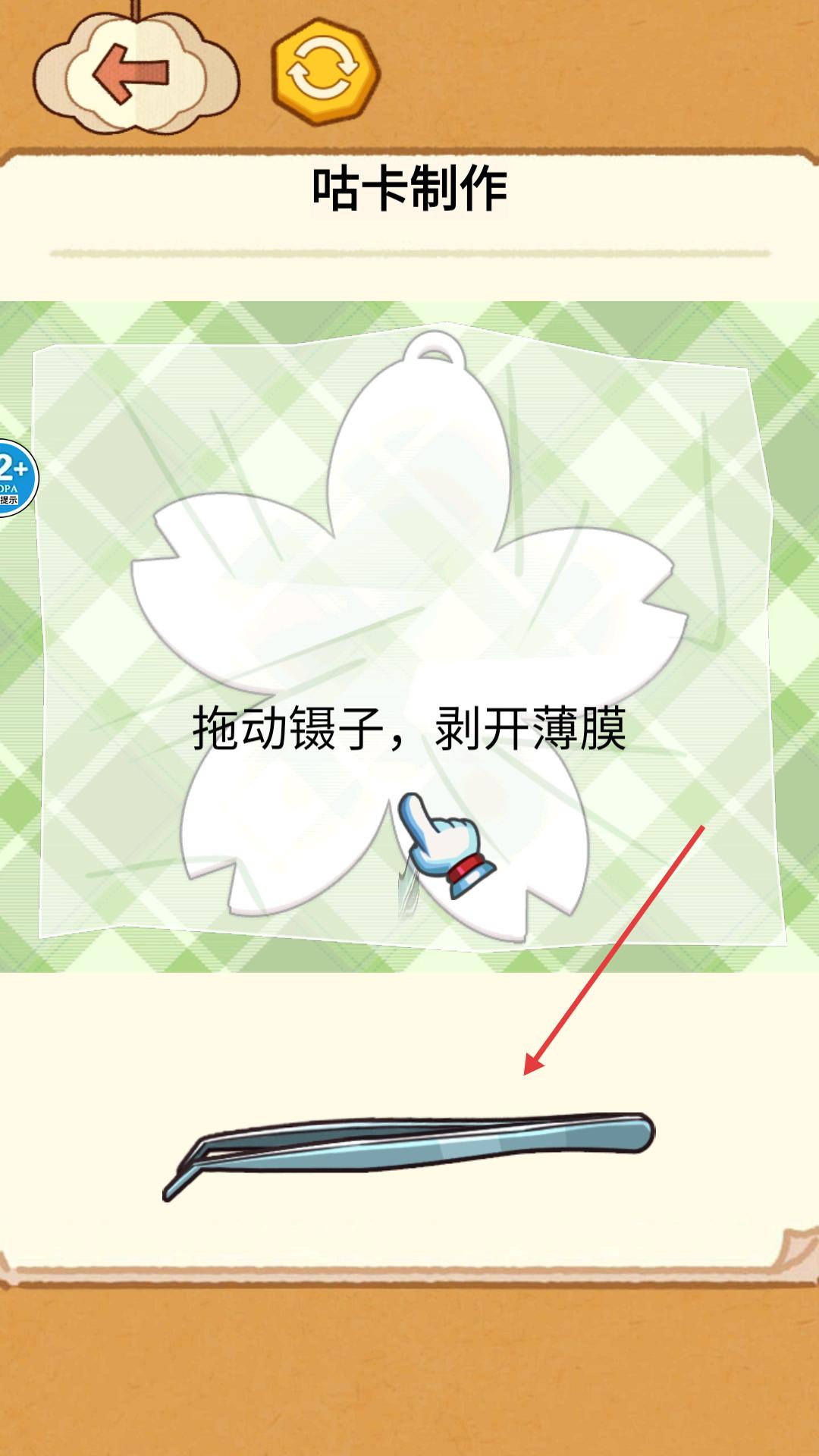 1、進入咕卡制作環節,首先按照提示,拖動鑷子,剝開圖案上的薄膜,為后續粘貼圖案做好準備。