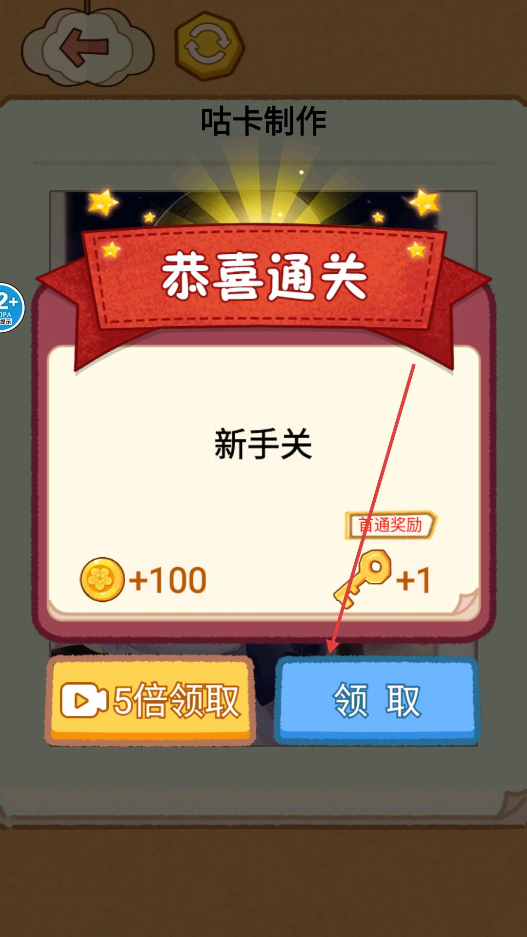 4、成功完成咕卡制作后,會彈出通關提示,此時點擊領取按鈕,就能獲取新手關的獎勵,包括金幣和鑰匙。