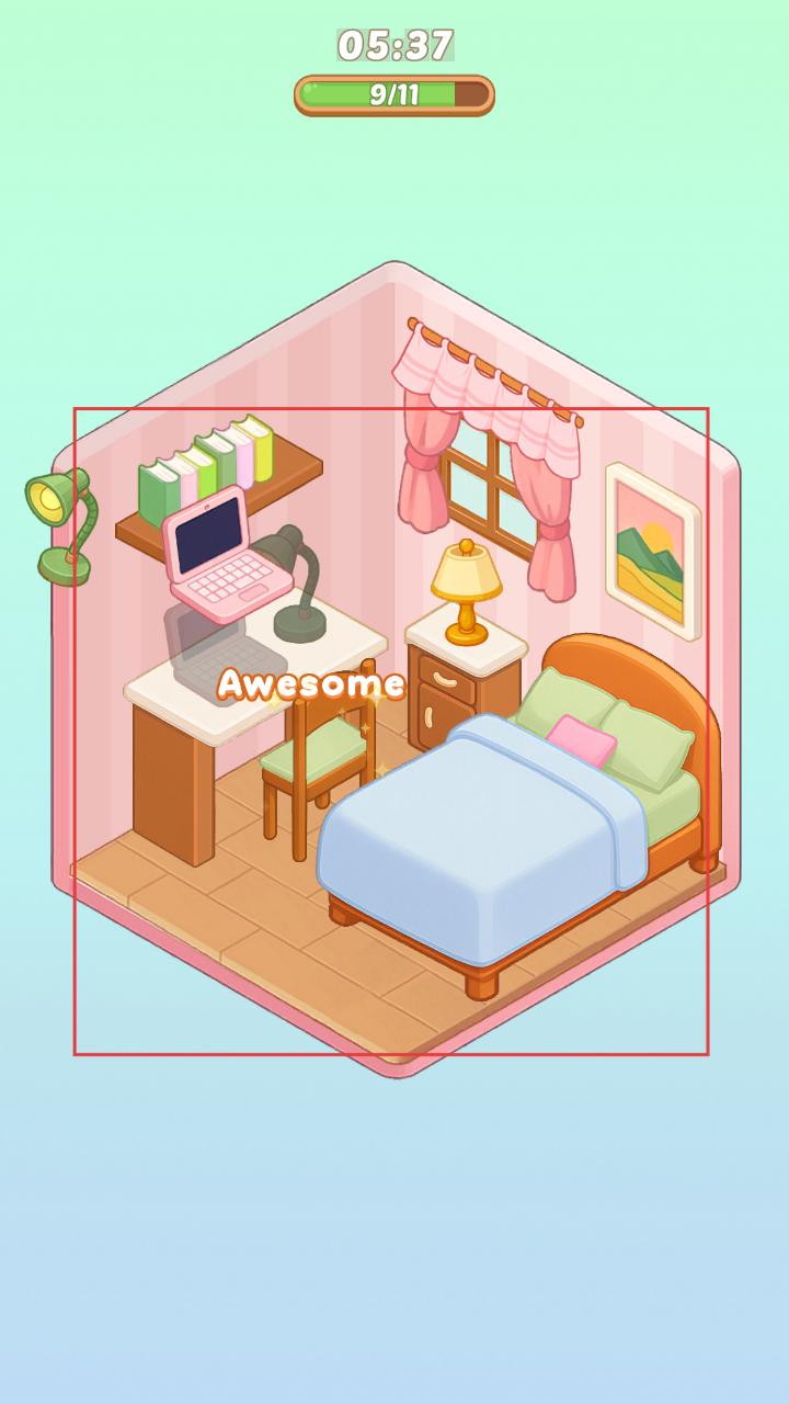 3、不斷使用紙箱里的物品布置房間,隨著布置推進,房間會逐漸變得溫馨且功能齊全,還會出現Awesome等提示,反饋布置效果。