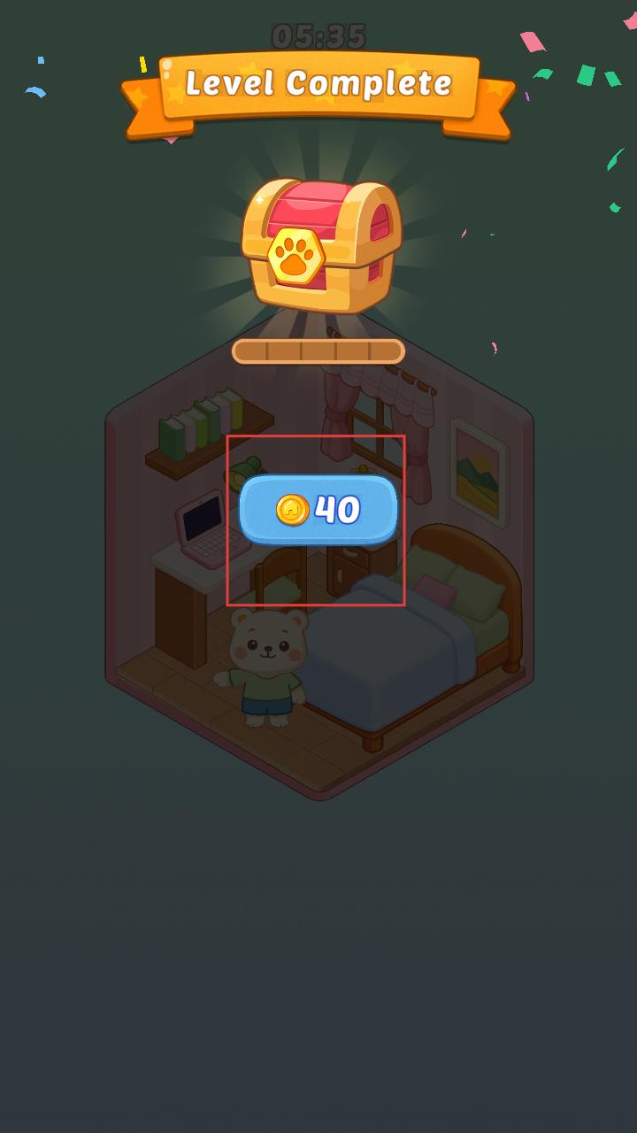 4、當房間布置完成,會顯示Level Complete,同時獲得40金幣等獎勵,可用于后續更多的房間布置與裝飾。