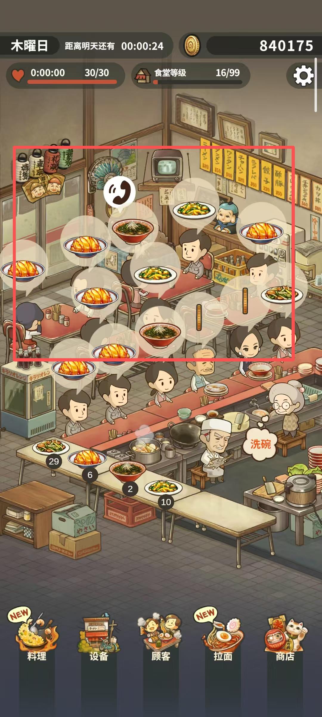 4、通過經營積累資源,提升食堂等級,升級后體力會回滿,能讓食堂有更好的經營狀態,也能解鎖更多新的內容,助力后續的拉面店經營。