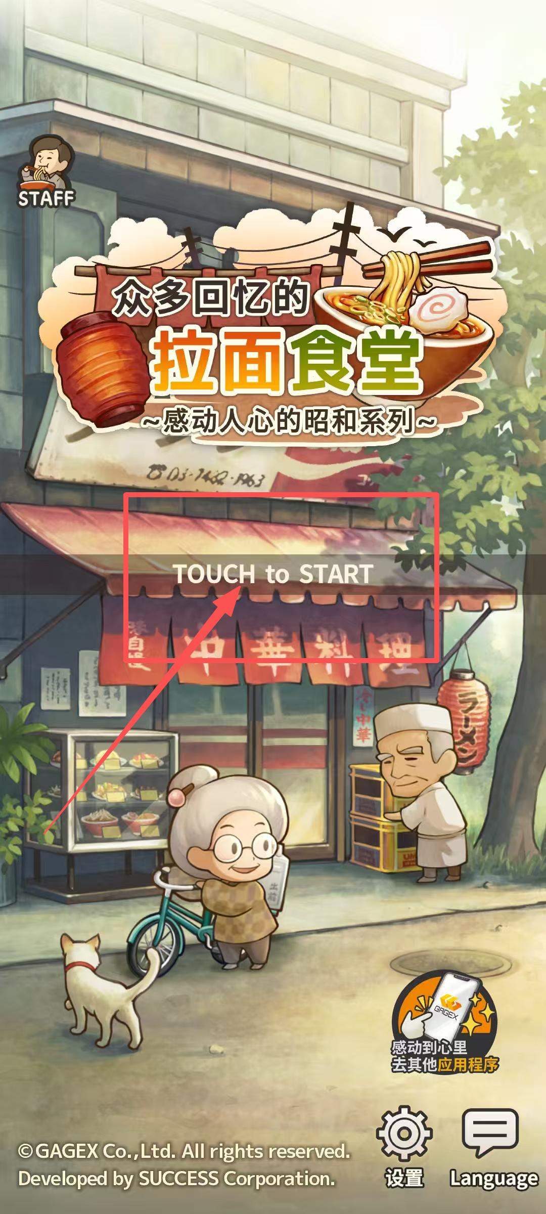 1、觸摸屏幕上的TOUCH to START,進入游戲,開啟在拉面食堂的經營之旅,這是游戲的初始啟動步驟,簡單操作就能進入后續環節。