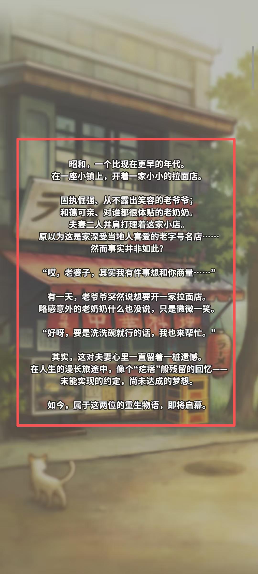 2、了解游戲背景,昭和年代的小鎮里,一對夫妻開拉面店,他們有著遺憾與夢想,這些故事為經營拉面店的過程增添了情感色彩,也讓玩家更有代入感。