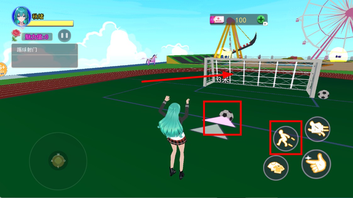 4、在足球場區域,靠近足球,點擊相關動作按鈕,可進行踢球射門操作,體驗校園運動樂趣。