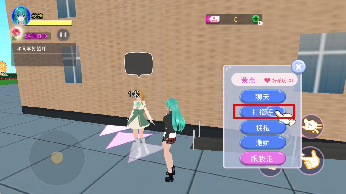 3、遇到其他角色時,可點擊打招呼按鈕,與對方互動,提升好感度,豐富校園社交體驗。