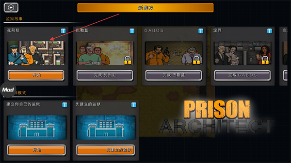 1、玩家下載游戲之后點擊新游戲然后點擊監獄故事,點擊開始即可開始游戲監獄建造游戲。