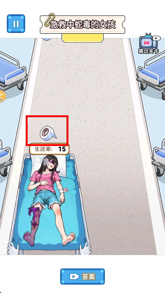 3、使用完鉗子后,選擇紗布道具,對處理后的傷口進行包扎,幫助女孩減少蛇毒影響。