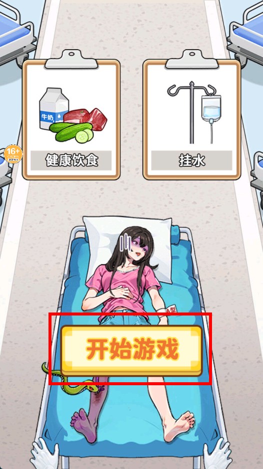 1、進入游戲會看到醫院場景的界面,點擊開始游戲按鈕,即可開啟急救中蛇毒女孩的挑戰。