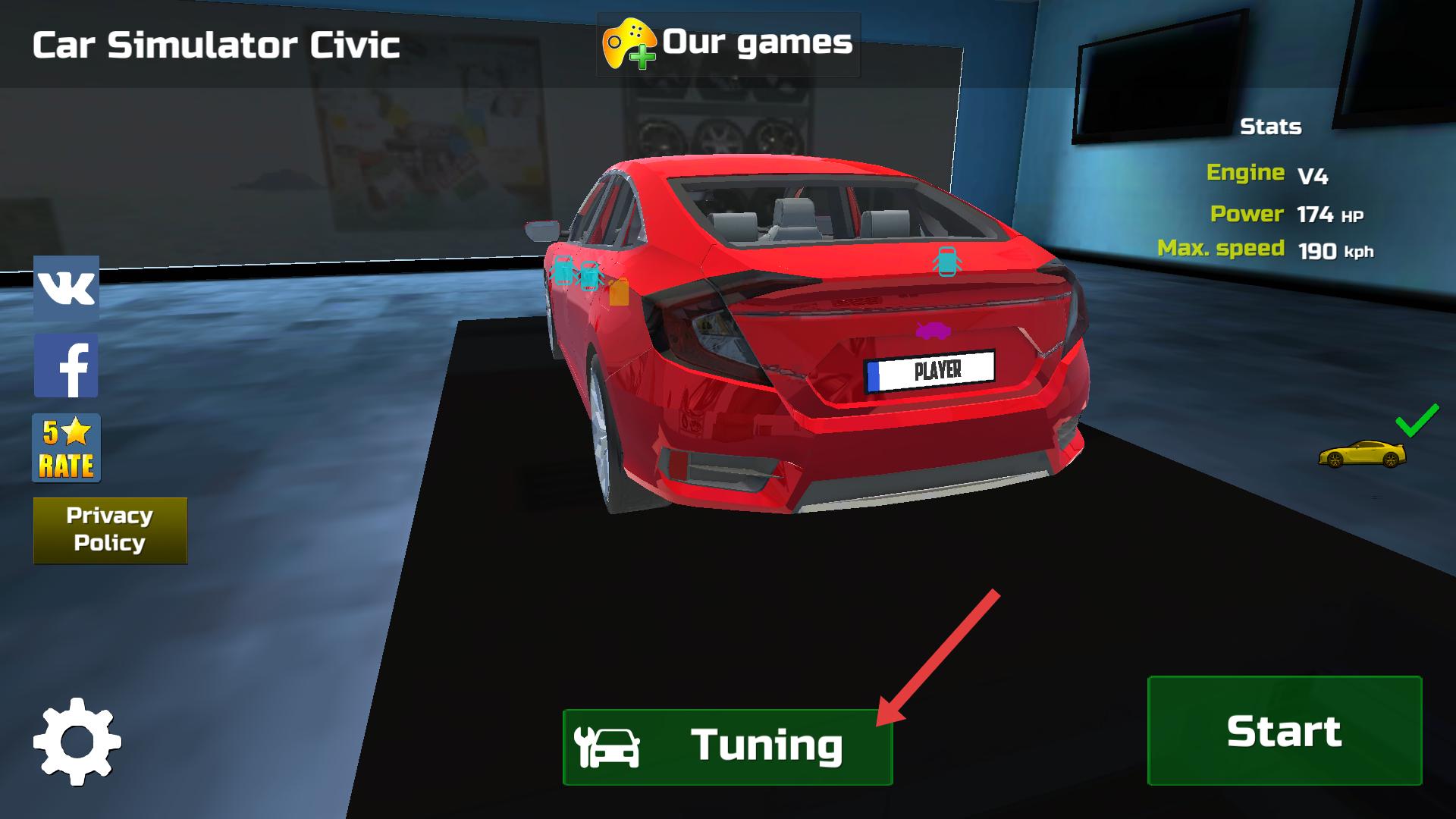 1、進入游戲,看到紅色汽車,若想改裝車輛,點擊Tuning按鈕,進入車輛改裝界面,可對車輛外觀等進行調整。