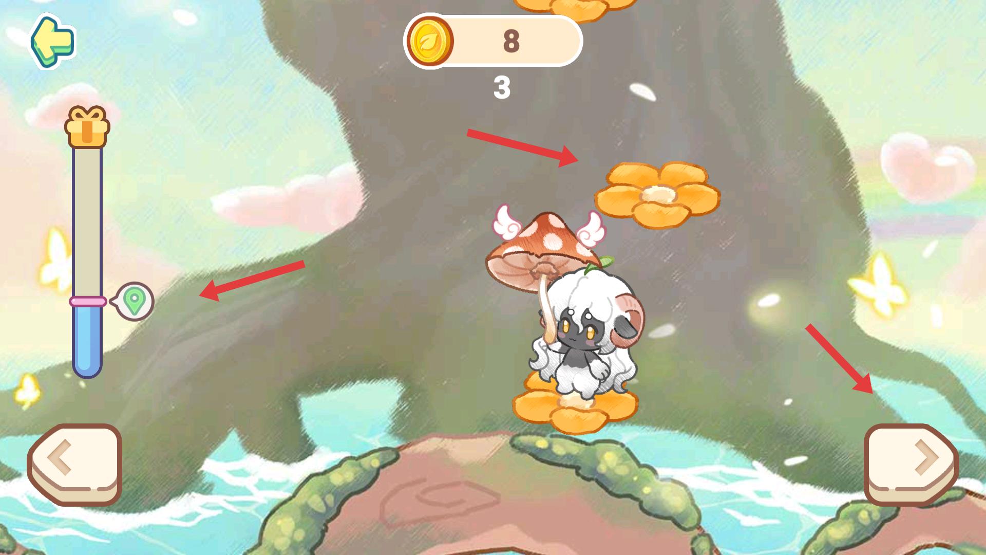 4、通過點擊左右方向按鈕控制角色移動,收集花朵等物品,同時留意左側進度相關顯示,推進游戲進程。