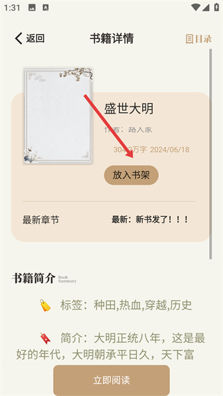 3、在書籍詳情頁面,可查看書籍的相關信息,若想后續方便閱讀,點擊放入書架按鈕。