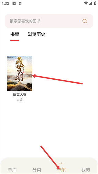 4、點擊底部的書架選項,進入書架頁面,此時能看到已放入書架的書籍,方便后續快速找到并閱讀。